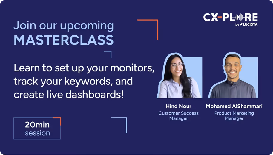 In just 20 minutes, this CX-PLORE Masterclass will show you how to build smart dashboards, track important keywords, and set up advanced monitoring using Lucidya.